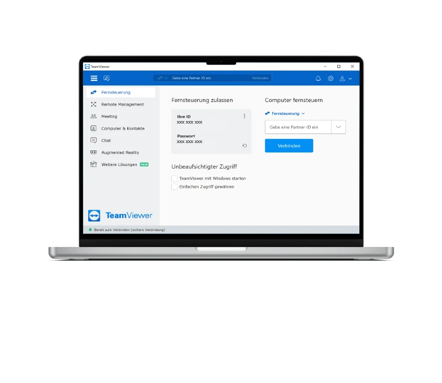 Für die sichere Verbindung zu Ihrem Gerät benötigen wir die TeamViewer ID und das generierte Zufallspasswort.